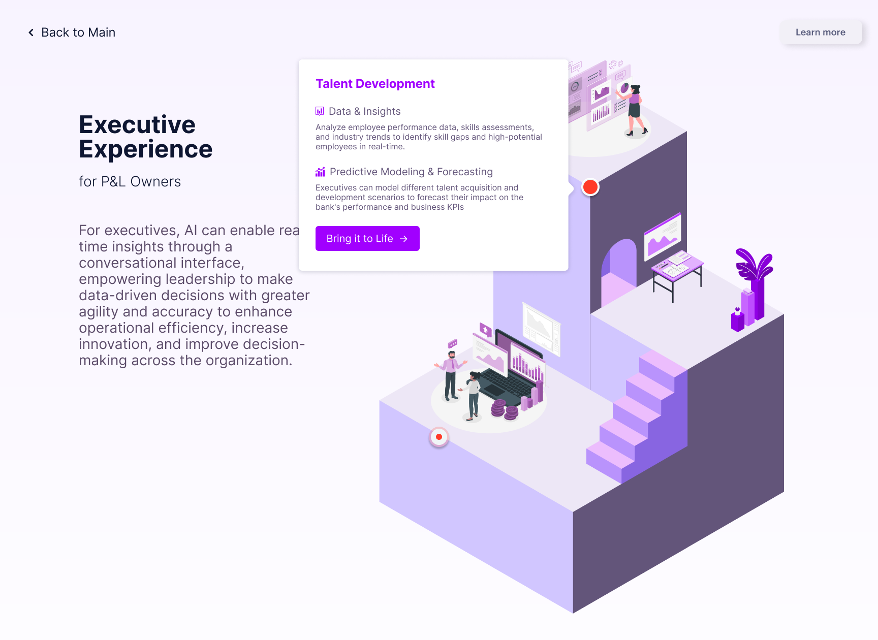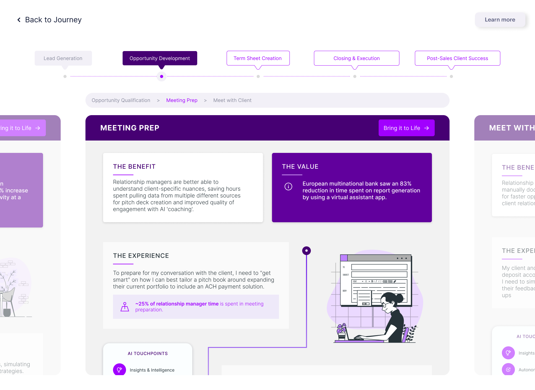 Designed future-state AI workflows for two distinct banking personas, then built the interactive demo that made the potential tangible for client executives. Five engagements secured.