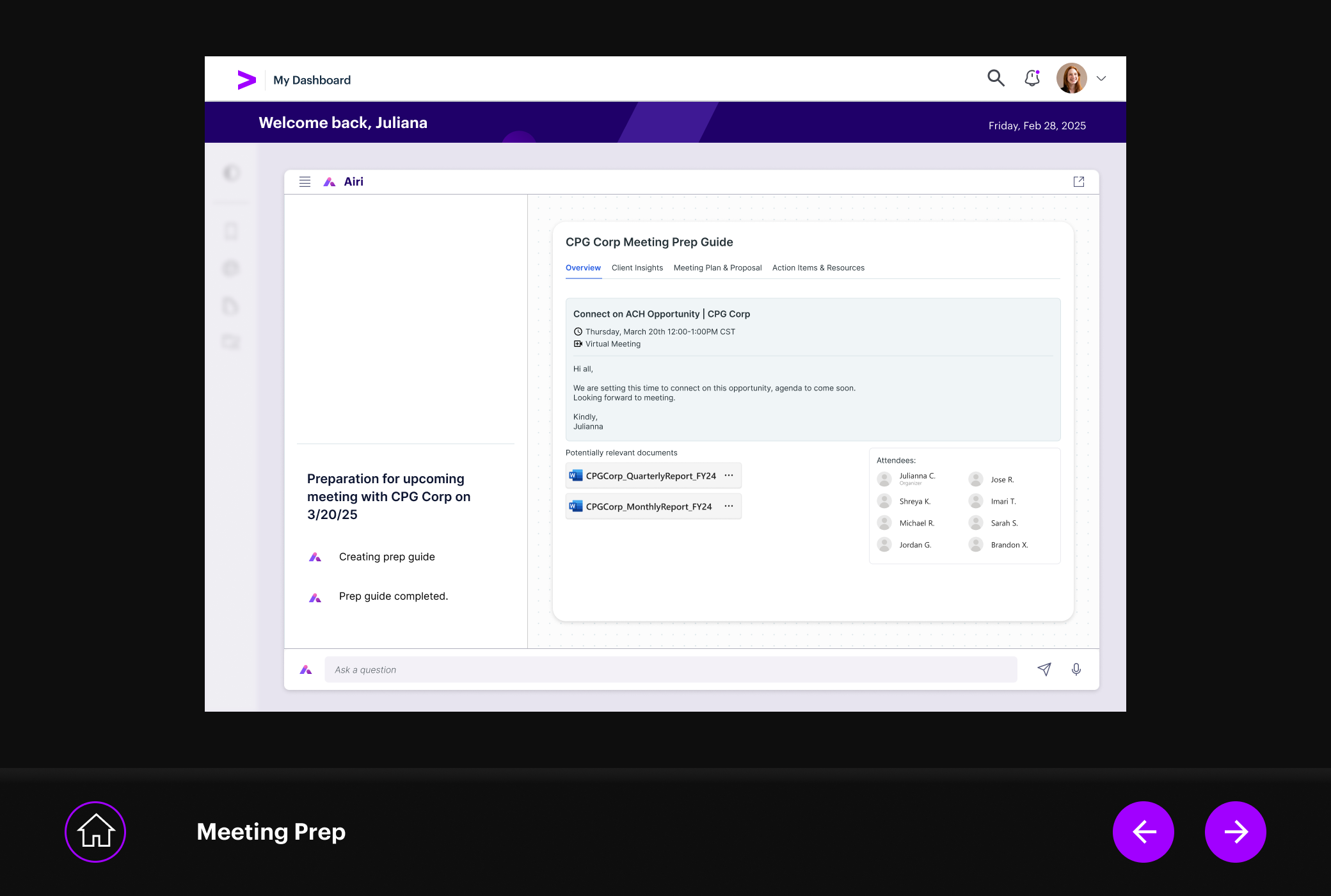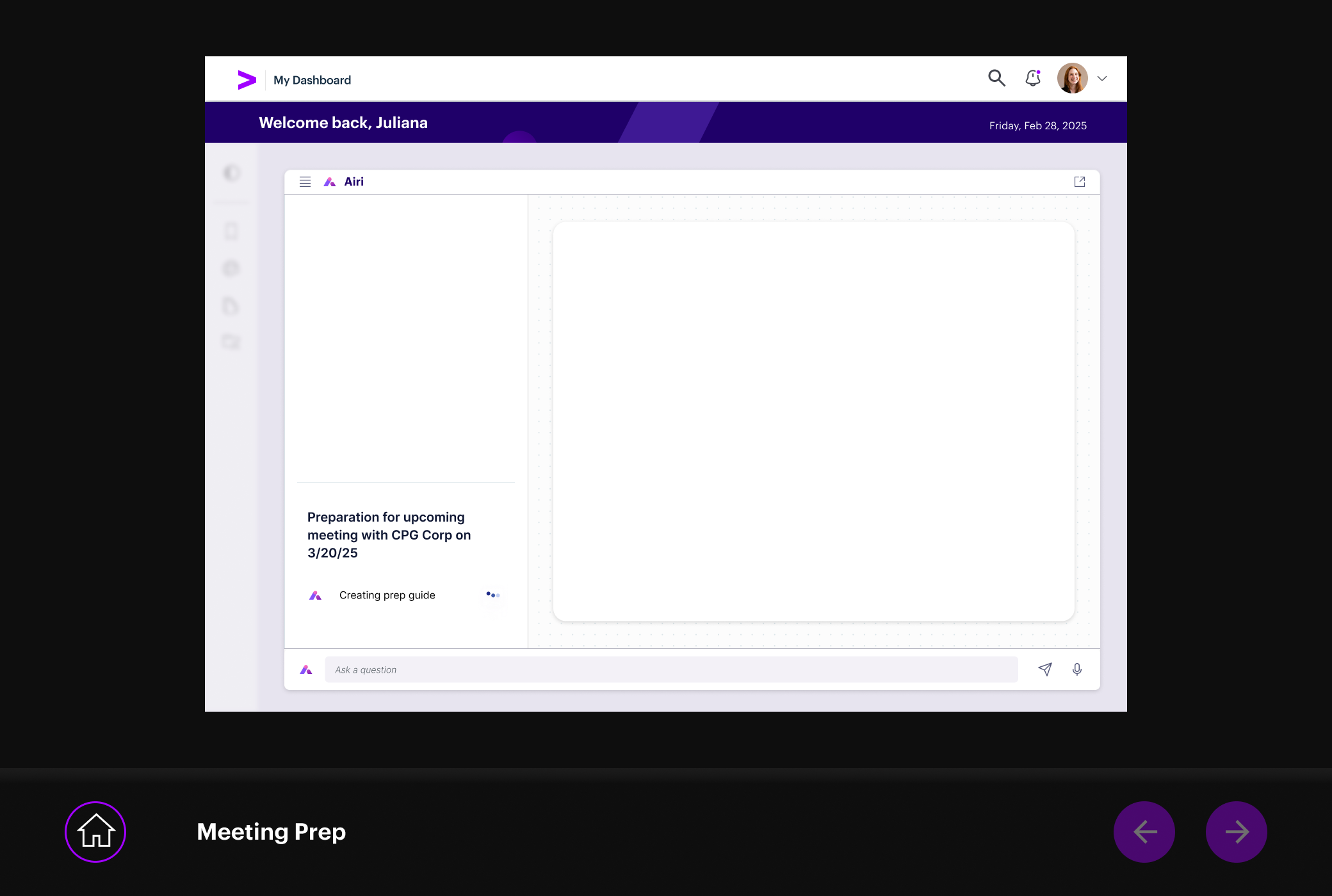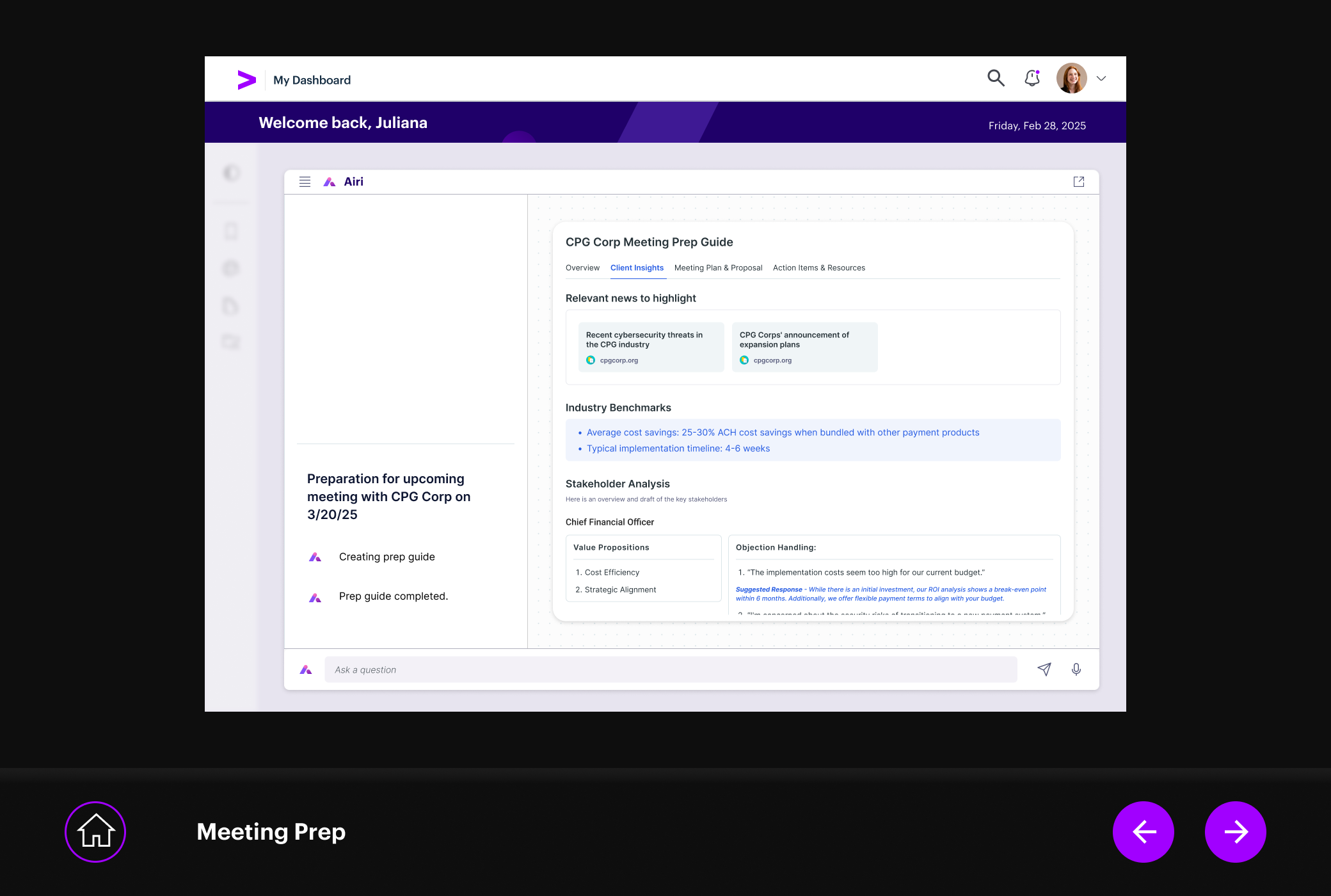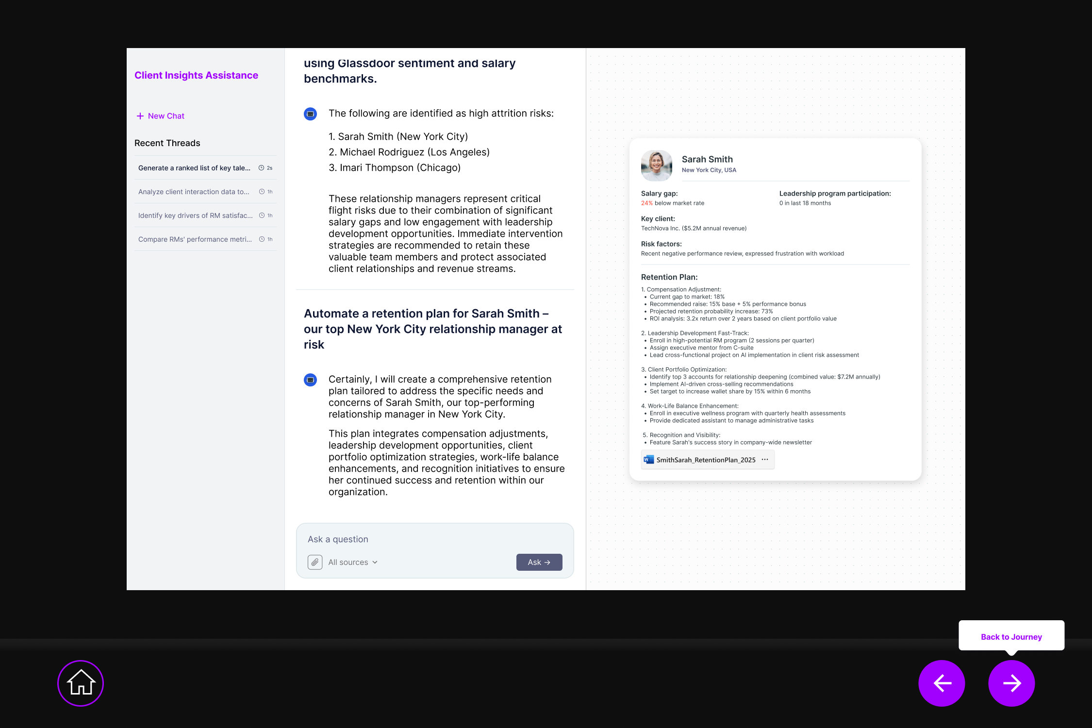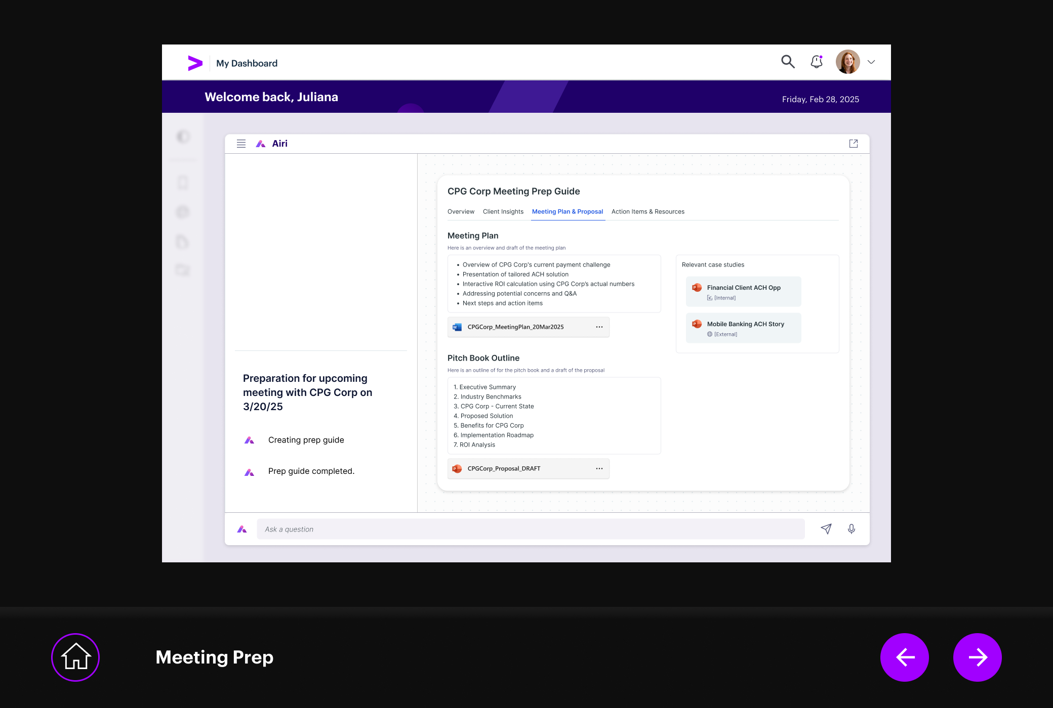 The meeting prep flow lets RMs talk to their data. Ask a question, get an answer grounded in account history, financials, and recent signals. The AI drafts talking points, flags risks, and suggests next steps. The RM decides what to take into the room.