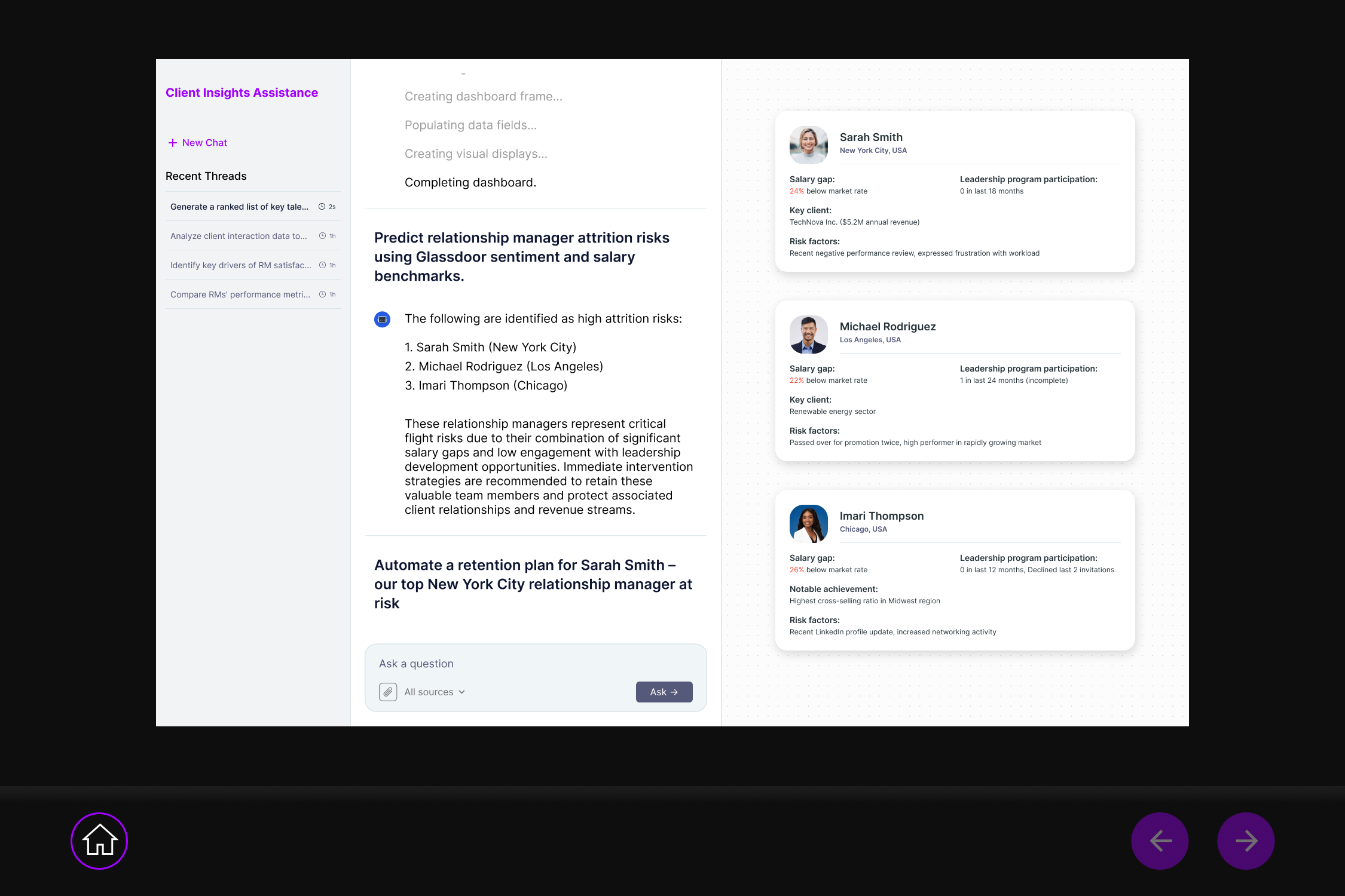 Beyond portfolio performance, executives needed a way to develop their teams. The talent development module gives leaders an AI-assisted view of each RM's strengths, skill gaps, and growth opportunities. The AI identifies patterns across the team, not just individuals, and suggests targeted development plans grounded in real performance data.
