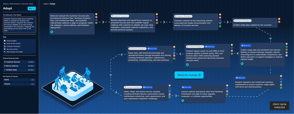 Clicking into an L1 stage expands the L2 layer: individual sub-processes with actor ownership, step type, and interaction notes. Shown here: the Adopt stage. Used as a shared alignment tool across Sales, Product, and Engineering.