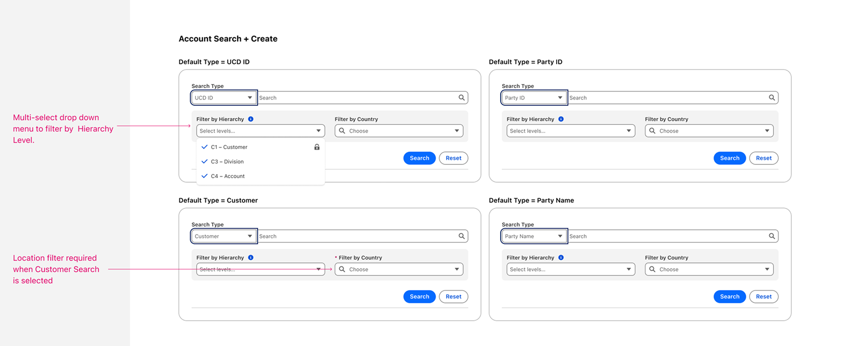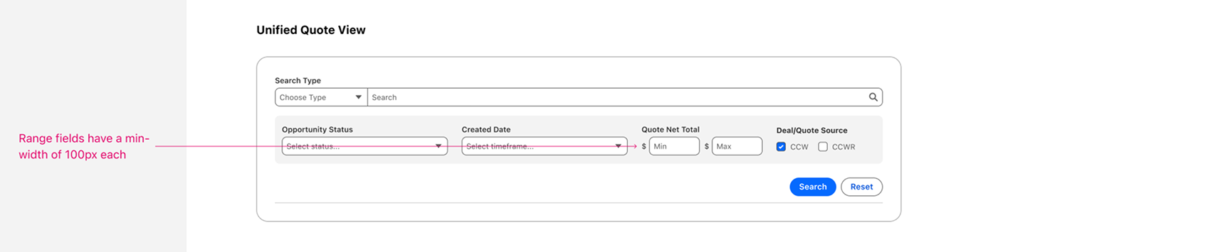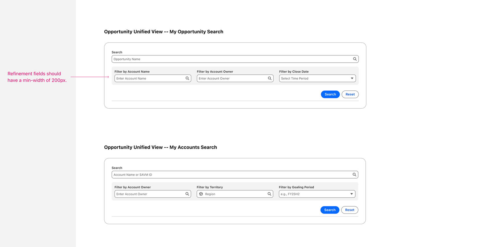 The same search module applied consistently across Opportunity Search, Account Search, and Quote View. Different data contexts, same structural pattern. Annotations visible in the specs were shared directly with engineering to enforce spacing and min-width rules.